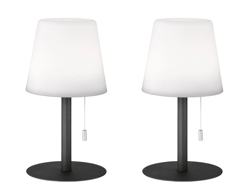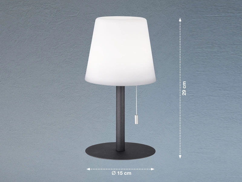 Das Tischleuchten 2er SET aus unempfindlichem, weißem und anthrazitfarbenem Kunststoff hat einen Durchmesser von jeweils 15 cm und eine Höhe von 29 cm. Da die Lampen keinen Strom benötigen, können sie überall frei platziert werden, ohne dass Sie auf Steckdosen in der Umgebung achten müssen! Dank Schutzart IP44 sind die Tischlampen dabei selbst an ungeschützten Stellen im Außenbereich unempfindlich gegen Spritzwasser, z.B. durch Regen.