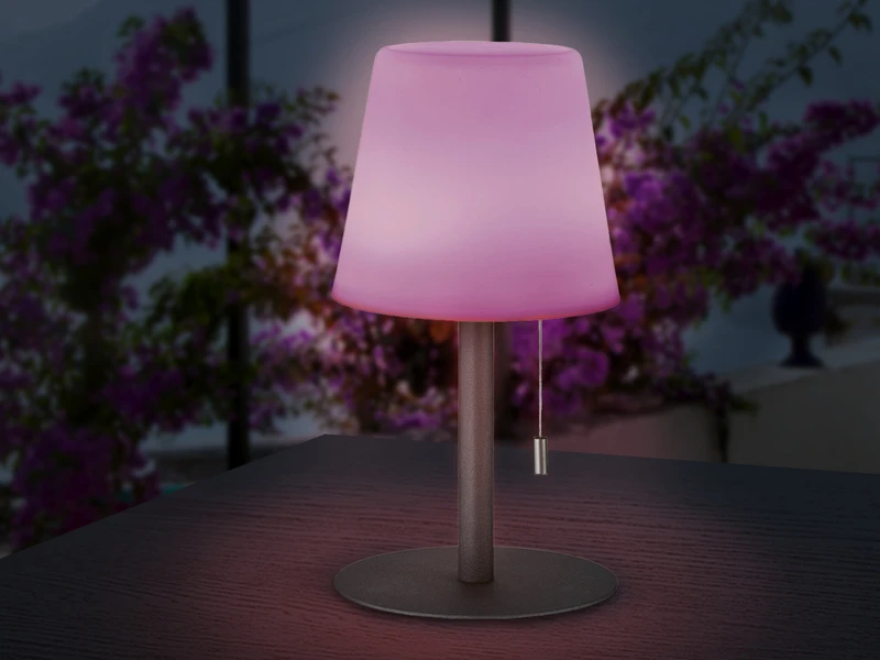 Über den praktischen Zugschalter können Sie die Außentischleuchten ein-/ausschalten, in 2 Stufen (100% – 20%) dimmen sowie – durch gezogen halten des Zugschalters – zusätzlich stufenlos eine individuelle RGB Farbe einstellen.