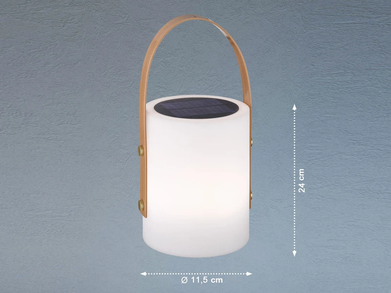 Die Solar Tischleuchte BARI aus unempfindlichem, weißem Kunststoff hat einen Durchmesser von 11,5 cm und eine Höhe von 24 cm. Dank des integrierten Akkus können Sie sie überall aufstellen, ohne sich Gedanken über ein Kabel machen zu müssen.