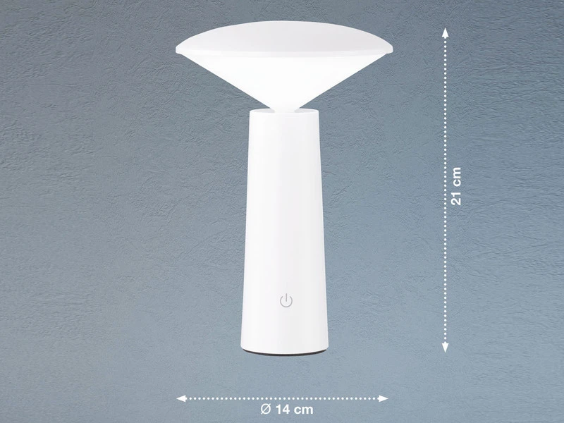 Die Tischleuchte aus unempfindlichem, weißem Kunststoff hat einen Durchmesser von 14 cm und eine Höhe von 21 cm. Der Leuchtenkopf ist schwenkbar und lässt sich individuell einstellen. Dank Schutzart IP44 ist die Tischlampe selbst an ungeschützten Stellen im Außenbereich unempfindlich gegen Spritzwasser, z.B. durch Regen.