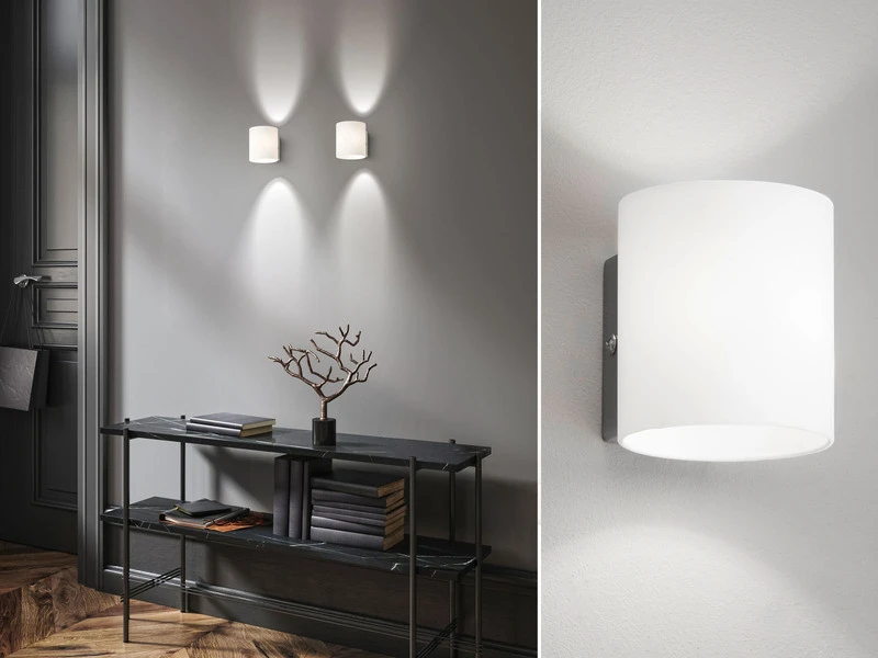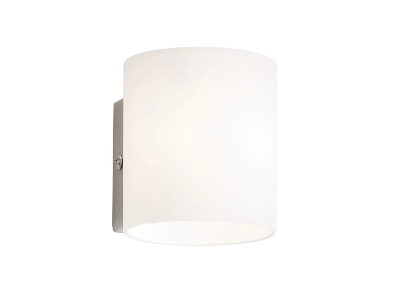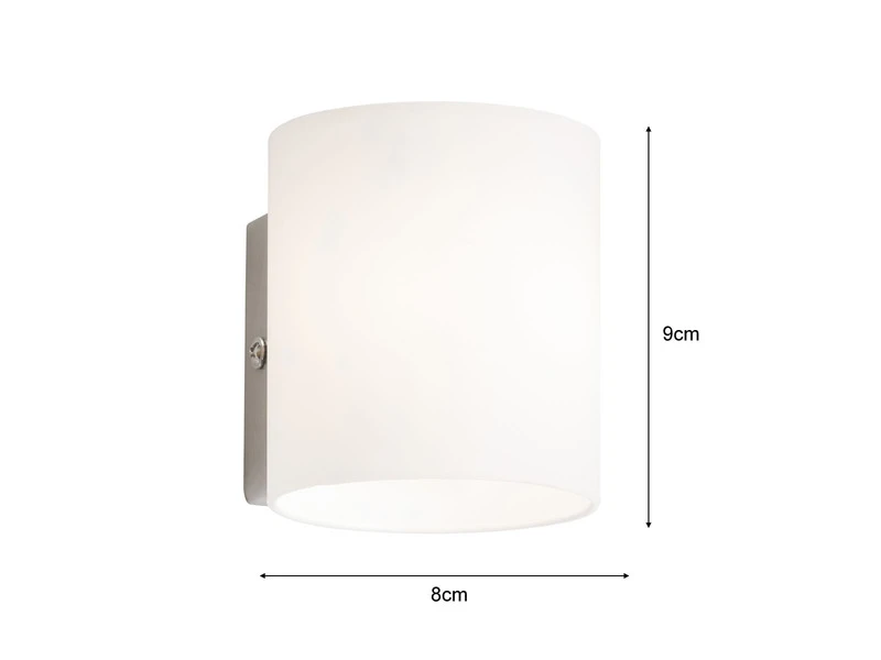Die kleine Wandleuchte hat eine Wandausladung von 10cm. Der zylinderförmige Lampenschirm aus weißem Opalglas hat eine Breite von 8cm und eine Höhe von 9cm. Er steht in perfekter Harmonie mit dem silber matten Korpus, an dem sich zur komfortablen Bedienung ein Ein/Aus Schalter befindet.