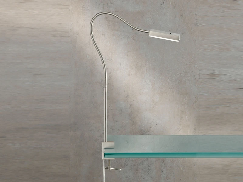 Der Korpus Klemmleuchte RAIK besteht aus silberfarbenem Metall und ist flexibel biegsam. Die Abdeckung der Brennstelle aus satiniertem Acrylglas sorgt für eine blendfreie Beleuchtung.