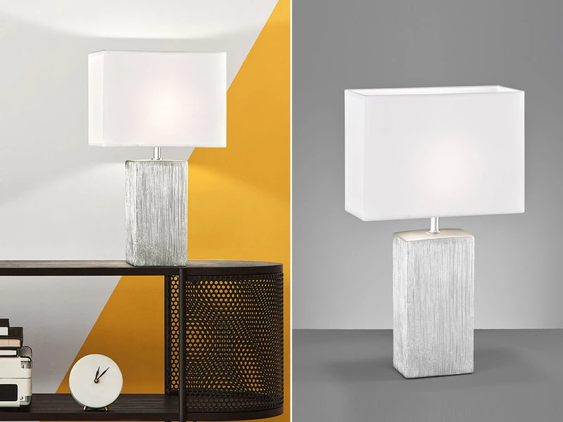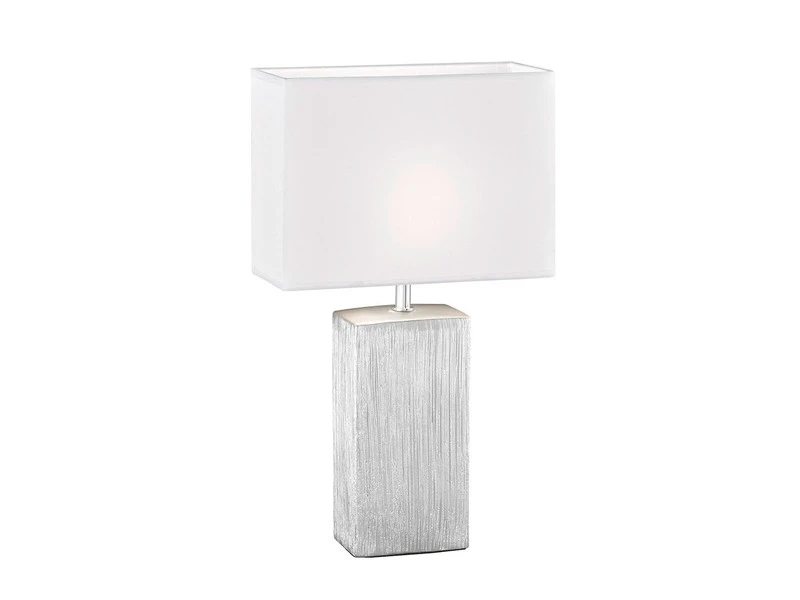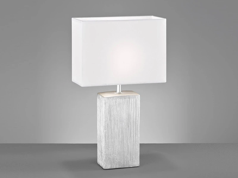 Das ansprechende Design der 50cm großen Tischleuchte erhält durch die elegante Form- und Farbgebung eine besondere Note. Der Leuchtenfuß ist aus strukturierter Keramik in Silberfarben Antik gefertigt. Die Kombination mit dem eckigen, 30x13cm großen Lampenschirm aus weißem Stoff macht die Tischleuchte zu einem eleganten Blickfang.