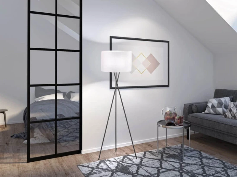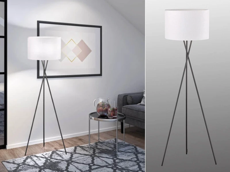 Die charakteristischen 3 Beine aus sandschwarzem Metall verleihen der insgesamt 160 cm großen Stehlampe ihren besonderen Charme und sorgen gleichzeitig für einen stabilen Stand. Der weiße Lampenschirm ist aus Leinen Stoff gefertigt und hat einen Durchmesser von 45 cm.