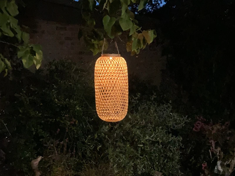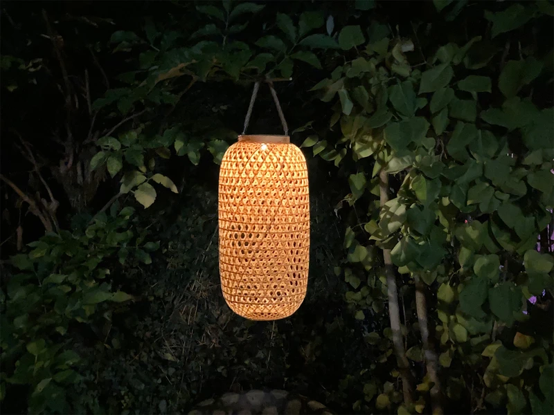 Der Korb der Solarlaterne ist aus Bambus geflochten, durch das Geflecht ist die Laterne mit gerade mal 450 Gramm besonders leicht und eignet sich perfekt zum Hängen.