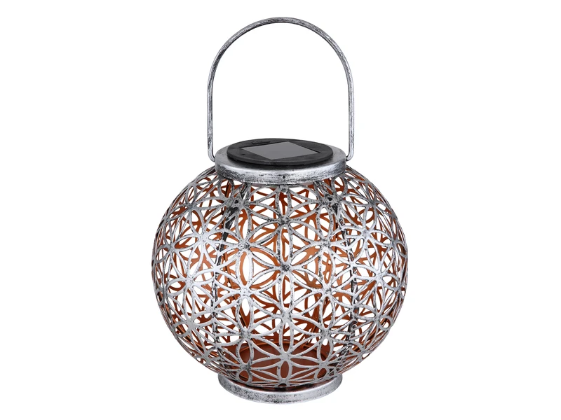 Die kugelförmige Solarleuchte hat einen Durchmesser von 20cm und ist ein echtes Dekoelement für Ihren Außenbereich. Sie besteht aus Metall in Silber Antik und erzeugt dank der Dekorstanzung und dem goldfarbenen Inneren ein eindrucksvolles Lichtspiel in Ihrem Outdoor Bereich. Die Solarlampe ist mit einem LED-Leuchtmittel mit 0,06 Watt ausgestattet, welches ein 3.000 Kelvin warmweißes Licht ausstrahlt. Sie wird über ein Solarpanel tagsüber aufgeladen, bei anbrechender Dunkelheit gibt sie ihr gespeichertes Licht wieder ab.