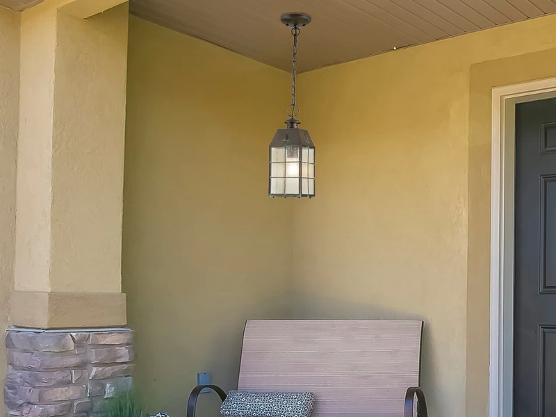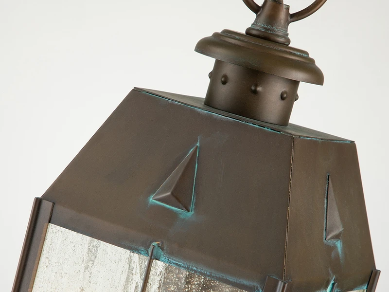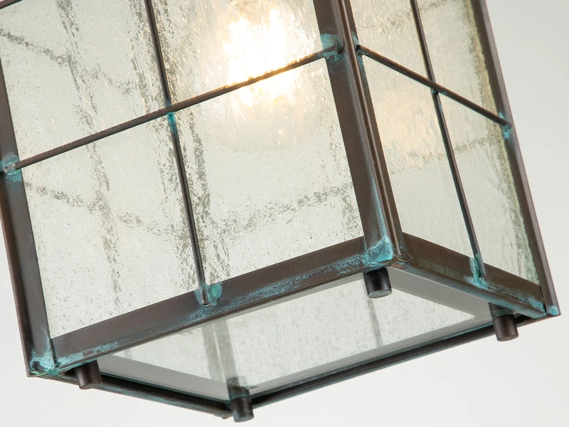 Die exklusive Außenlaterne ist aus massivem Messing gefertigt und mit antiker Patina belegt; der Lampenschirm aus strukturiertem Klarglas rundet das angenehme Erscheinungsbild dieser robusten Außenleuchte ab.