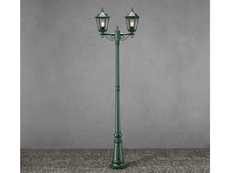 Die Gartenlaterne besteht aus grün lackiertem Aluminium und klarem Glas. Sie wird inkl. Pfahl und Befestigungsstange für Fundament geliefert. Der Standfuß hat einen Durchmesser von ca. 26 cm.