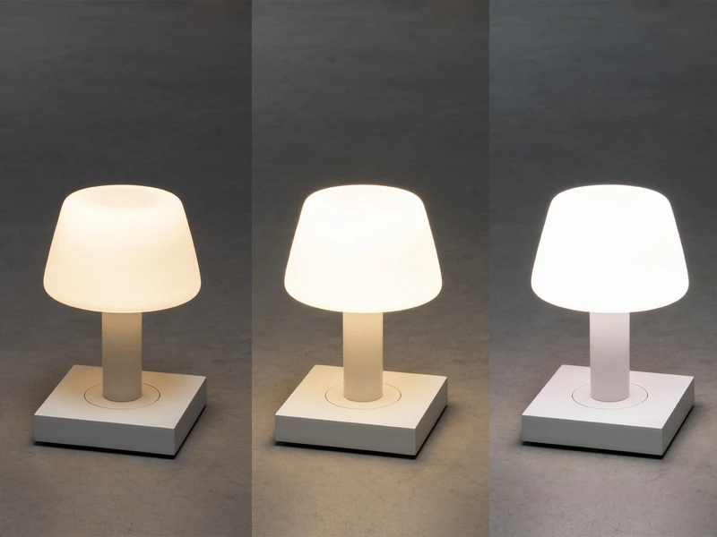 Im Schirm ist die LED-Lichtquelle integriert, die über die Touch-Bedienfläche am Sockel gesteuert wird. Neben dem Schalten ist zudem ist der Wechsel zwischen zwei warmweißen Tönen möglich (2700K oder 3000K)