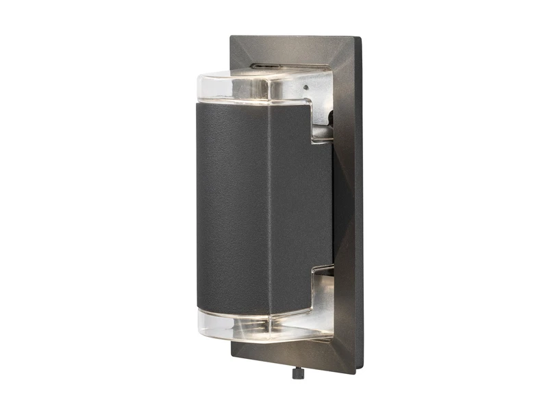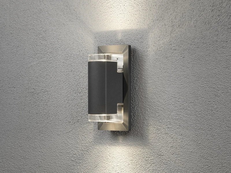Die Außenleuchte ist aus anthrazit lackiertem Aluminium mit zwei Abdeckungen aus klarem Acrylglas.