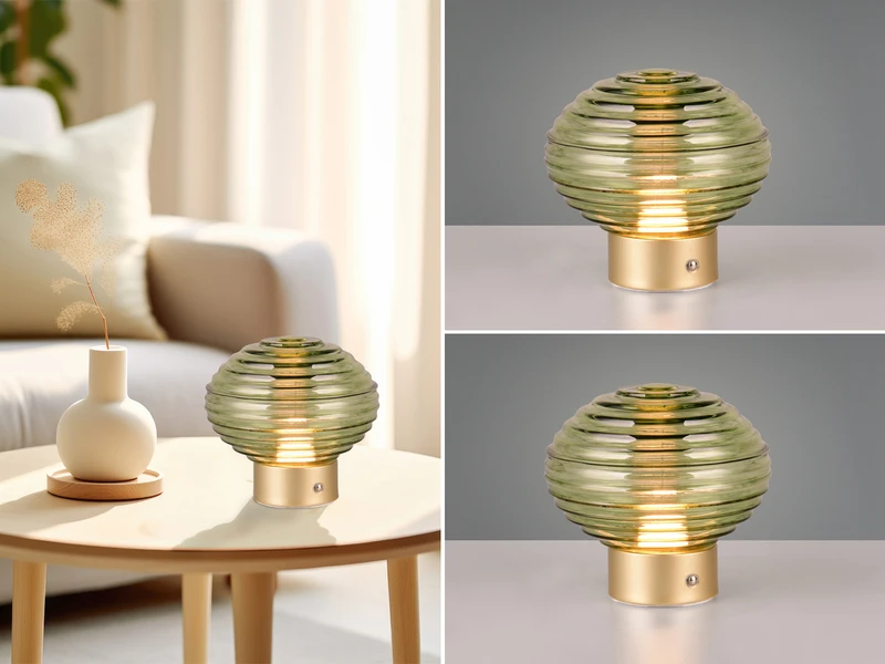 Der Grüne Glas Lampenschirm in Wellenoptik ist mit einem fest verbauten LED mit einer Leistung von 1,5 Watt und 100 Lumen in warmweiß (3000 Kelvin) bestückt und spendet warmes Licht, dass sich über die Sensortaste am Leuchtenfuß in 3 Stufen dimmen lässt.