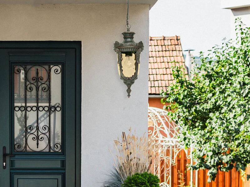 Im traditionell englischem Stil gehalten, erinnert diese Outdoor Pendelleuchte an Laternen aus vergangenen Zeiten um 1900. Der Lampenschirm besteht aus Amberglas. Die detailreichen Metallelemente in Bronze sind handbemalt und verleihen dieser Außenleuchte den typischen antiken Laternenlook.