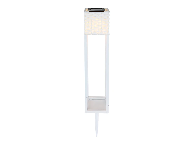 Durch dem eckigem Metallgestell und der mit weißem Rattan überzogener Oberseite, sind diese Erdspießleuchten alles andere als gewöhnlich.