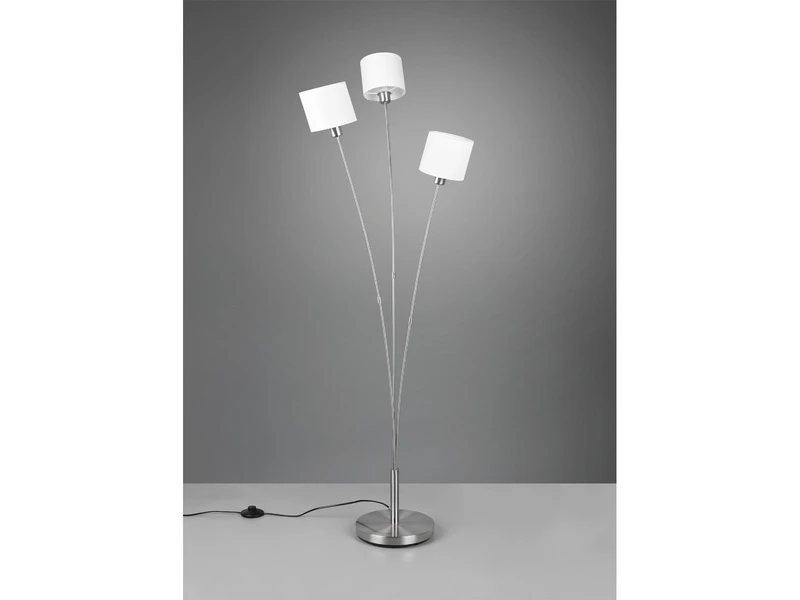 Die 3 flammige 150cm große Stehleuchte schafft Akzente und steht für ein wohnliches Licht, da Textilschirme den Behaglichkeitsfaktor erhöhen und ein gemütliches Ambiente zaubern. Zeitgleich kreieren die klaren Formen einen modernen und schlichten Stil, der sich vielseitig einsetzten und kombinieren lässt. In Silber matt mit Lampenschirm in Weiß rundet die Stehleuchte moderne Einrichtungsstile optimal ab. Die Designer Leuchte ist aus Metall hergestellt, und wird bequem per Fußschalter ein-aus geschaltet.