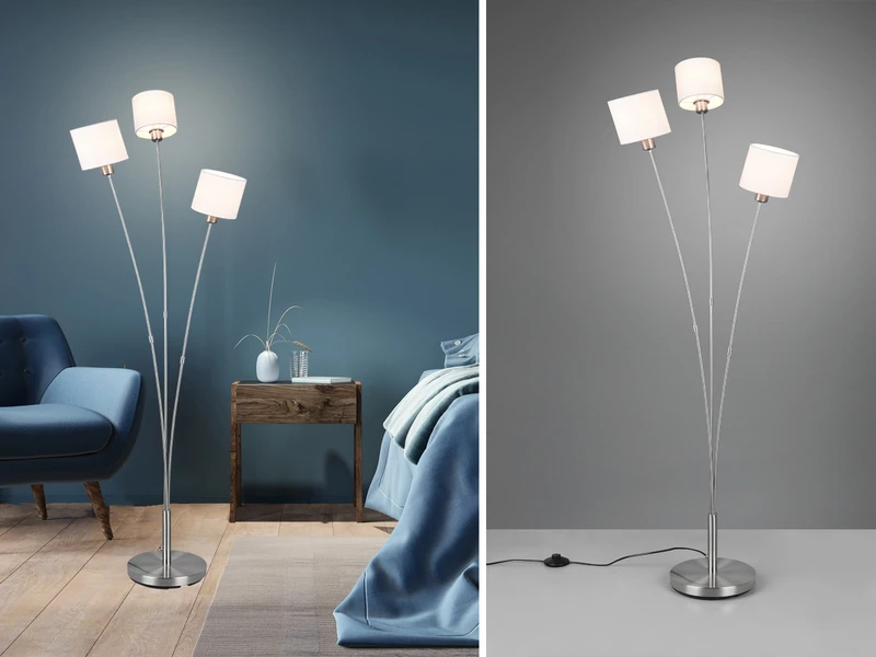Die Stehleuchte ist mit drei E14 Fassungen ausgestattet und wird inklusive drei stufenweise dimmbaren LED Leuchtmitteln a´ 4,9 Watt, 470 Lumen & 3000 Kelvin in Warmweiß geliefert.