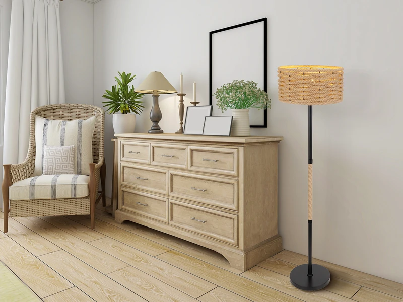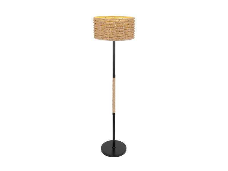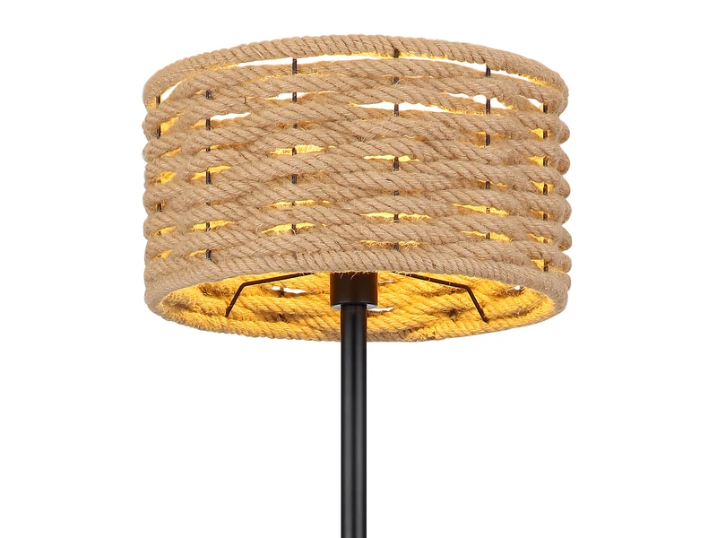 Diese naturverbundene Stehleuchte beeindruckt durch Ihre Materialkombination aus Metall und Hanfseil. Die Leuchte besteht aus einem runden schwarz matten Metallsockel, einem teilweise mit Hanfseil umwickelten Metallständer und einem wunderschönen geflochtenen Schirm aus Hanfseil. Das ausgestrahlte Licht wird angenehm im Raum verteilt und lässt ein gemütliches Ambiente entstehen. Darüber hinaus verfügt die Stehlampe über einen Fußschalter für Ein/Aus, mit dem sie sich komfortabel bedienen lässt.