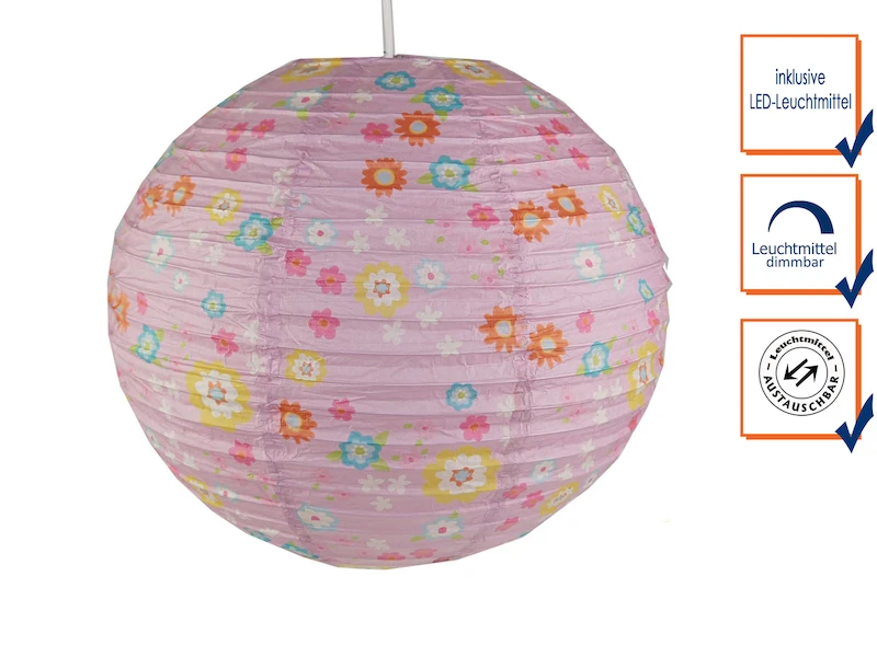 Die Kinder Hängelampe mit Papier Lampion ist vielseitig in jedem Kinderzimmer einsetzbar – mit ihrem kindgerechten und ansprechenden Blümchen Design sorgt die Kinder Deckenleuchte für Begeisterung. Ganz gleich ob Sie auf der Suche nach Kinderlampen für Mädchen oder Kinderzimmerlampen fürs Baby sind, mit der neutralen Farbgebung und dem fröhlichen Blümchen Motiv ist diese LED Kinderleuchte für viele Kinderzimmer geeignet. Auch als Deckenlampe im Babyzimmer macht dieses Kinderlicht eine angenehme Atmosphäre. Der Papierlampenschirm der Kinder Hängeleuchte hat ein Durchmesser von 40 cm.