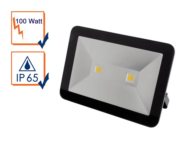 Gefertigt ist der Strahler aus robustem, schwarzem Aluminium. Mit seinem schlanken Design nimmt er auch an beengten Stellen wenig Platz ein. Der LED Scheinwerfer ist 5,6cm dick und hat ein Außenmaß von HxB 25,5 x 36cm. Er überzeugt er mit einer enorm starken Leistung von 100 Watt, 10800 Lumen & 4000 Kelvin in Neutralweiß.