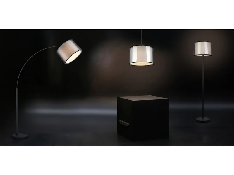 Die Leuchten der Serie BURTON sind mit ihren Textilschirmen der Inbegriff für Behaglichkeit. Das wohnliche Licht der Stehleuchte, welches durch die beiden verschiedenfarbigen Schirme ein gemütliches Ambiente zaubert, setzt besondere Lichtakzente. Die moderne Kombination aus einem inneren weißen Stoffschirm und einem äußeren transparent schwarzen Organza Stoffschirm wirkt individuell sowie erfrischend und lässt sich vielfältig in moderne Wohnstile integrieren.
