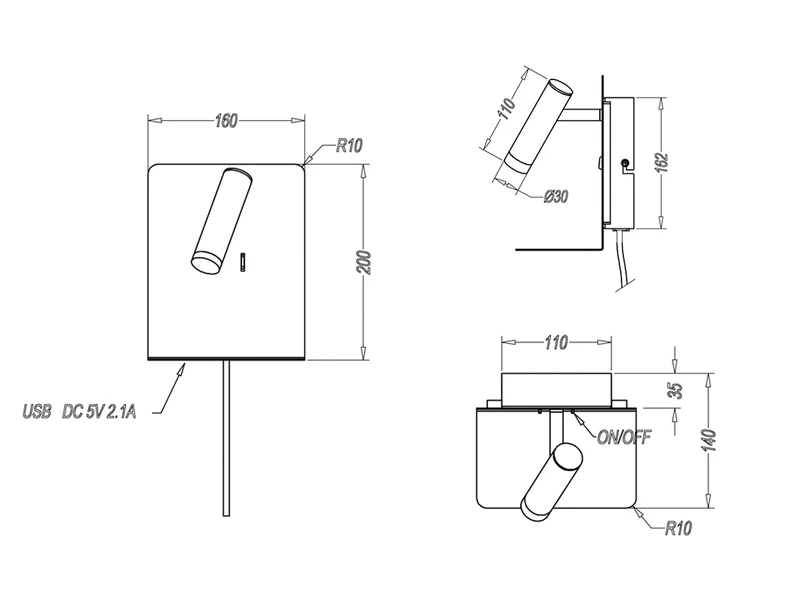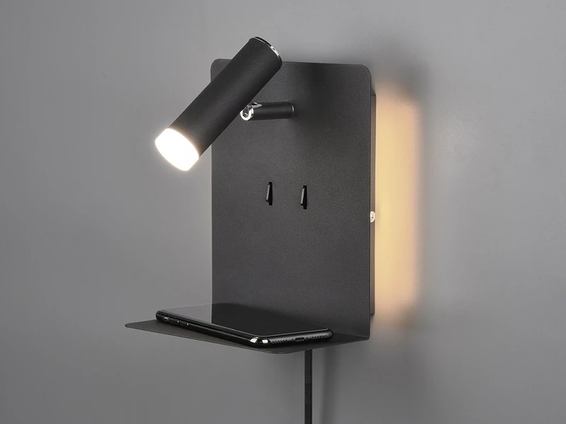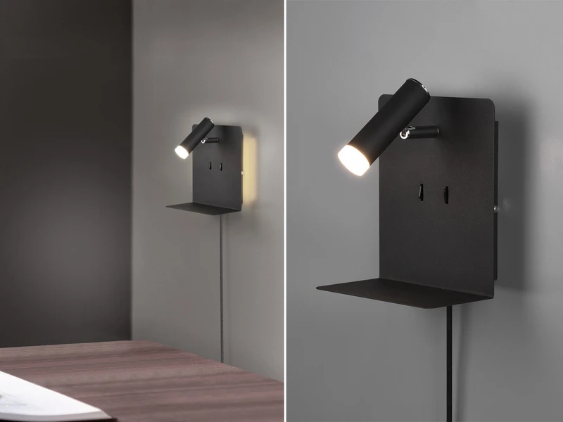 Zusätzlich verfügt die Wandleuchte über eine Ablage sowie einen USB-Anschluss mit Ladefunktion, so dass elektronische Geräte problemlos abgelegt und gleichzeitig geladen werden können. Des Weiteren ist die Leuchte dank des Features FLEXconnect sowohl für den Festanschluss als auch für den Gebrauch mit Steckerzuleitung geeignet.