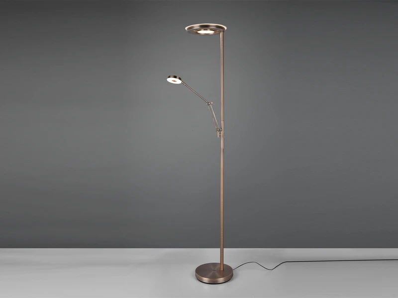 Die Farbgestaltung in Altmessing lässt sich sowohl in klassischen, als auch in modernen Wohnräumen wunderbar integrieren. Die Standlampe ist mit einem fest verbauten SMD-LED Modul mit 32 Watt und 4000 Lumen und einem fest verbauten SMD-LED Modul mit 6 Watt und 600 Lumen ausgestattet.