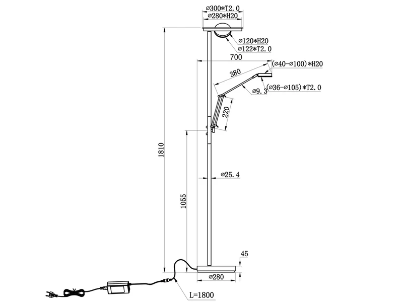 Die moderne Standleuchte hat einen Höhe von ca. 181cm und einen Ausladung von ca. 70cm, dazu hat der Fuß einen Durchmesser von 28cm.