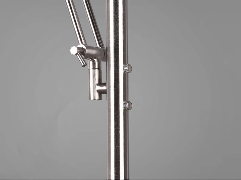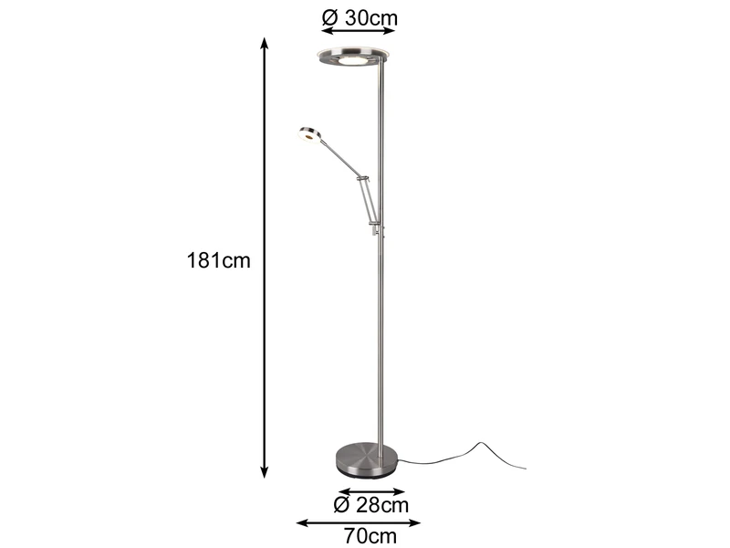 Die Farbgestaltung in Silber Nickel matt lässt sich sowohl in klassischen, als auch in modernen Wohnräumen wunderbar integrieren. Die Standlampe ist mit einem fest verbauten SMD-LED Modul mit 32 Watt und 4000 Lumen und einem fest verbauten SMD-LED Modul mit 6 Watt und 600 Lumen ausgestattet.
