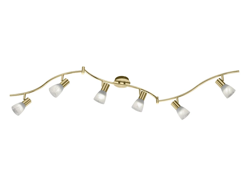 Der LED Deckenstrahler hat eine Höhe von 21 cm und eine Breite von 180 cm und wird mit sechs austauschbaren E14 LED-Leuchtmitteln mit je 5 Watt und 400 Lumen in warmweiß geliefert.