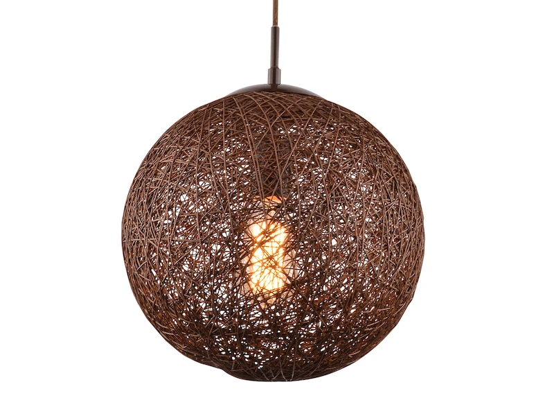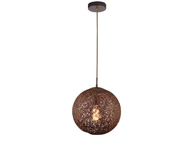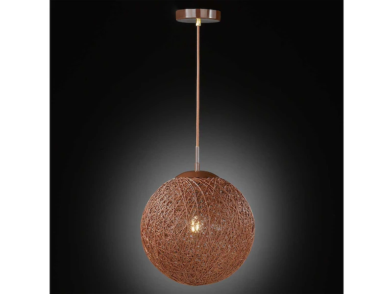Der Lampenschirm ist aus einem, mit braunem Kunststoff ummantelten, filigranen Aluminiumgeflecht. Im eingeschalteten Zustand erzeugt die Hängeleuchte, die eine ca. 150 cm langen Abhängung hat, raffinierte Lichteffekte. Das einzigartige Erscheinungsbild der Pendelleuchte macht sei zu einem Hingucker in Ihren Räumen.